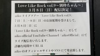 LLR Love Like Rock vol.9〜別枠ちゃん〜 aiko Live TourLove Like Rock vol.9概要コロナの影響で3月7,8日のライブ(最終日含む)を延期することに...そして3月7.8日のライブを延期する事になりましたごめんなさい。今ツアー最後のライブやったので出来... LLRrock9特別なライブ、LL以外
